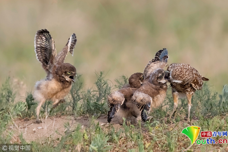 当地时间2018年6月20日,美国科罗拉多州,穴居猫头鹰妈妈正在给宝宝喂食,看起来好像在做牙齿检查一样。虫子是猫头鹰爸爸抓来的,饥饿的猫头鹰宝宝蜂拥而上迎接它们的父母,争相做那只第一个进食的宝宝。音乐家Hilary Bralove在旅行途中拍下了这令人兴奋的画面。图片作者/视觉中国