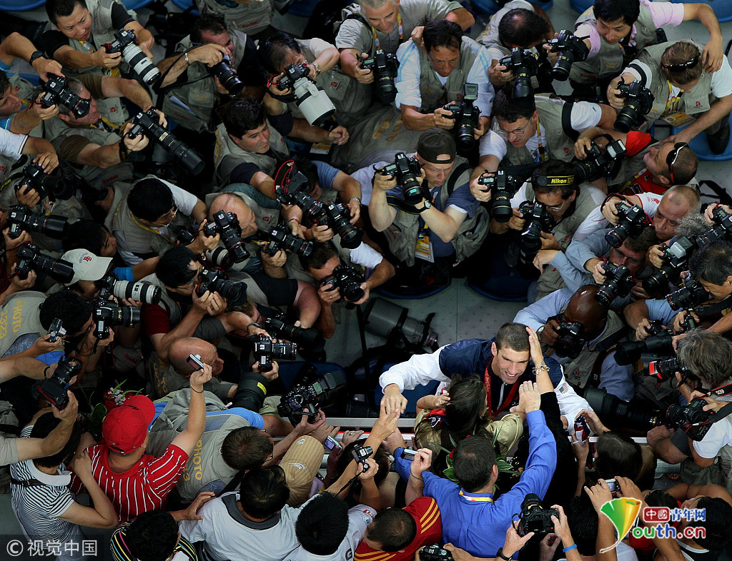 2008年8月17日,北京,国家游泳中心-水立方,北京奥运游泳男子4X100米混合泳接力决赛,美国队夺冠,菲尔普斯梦圆八金,赛后与家人分享胜利,成为记者追逐的焦点。