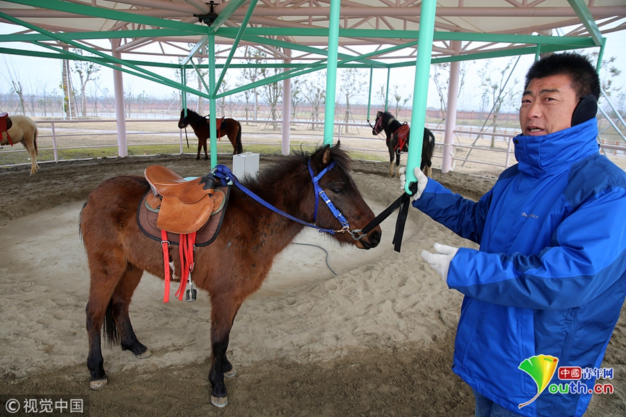 国内国外有的马场平时遛马就有类似的装置,专门有轨道和横杆,我们这个是简化的,而且是没有机器牵引,马的走走停停都靠口号就可以控制,也不是走个不停;在马的饲养方面都是很用心的,马的屁股都是圆圆的,如果饲养的不好,会特别瘦;这个马是广西的矮马,是成年的马。都是经过训练,都很乖的,给个口号怎么摸都可以,也是希望通过这个项目给小朋友一种全新体验,接触动物了解动物。