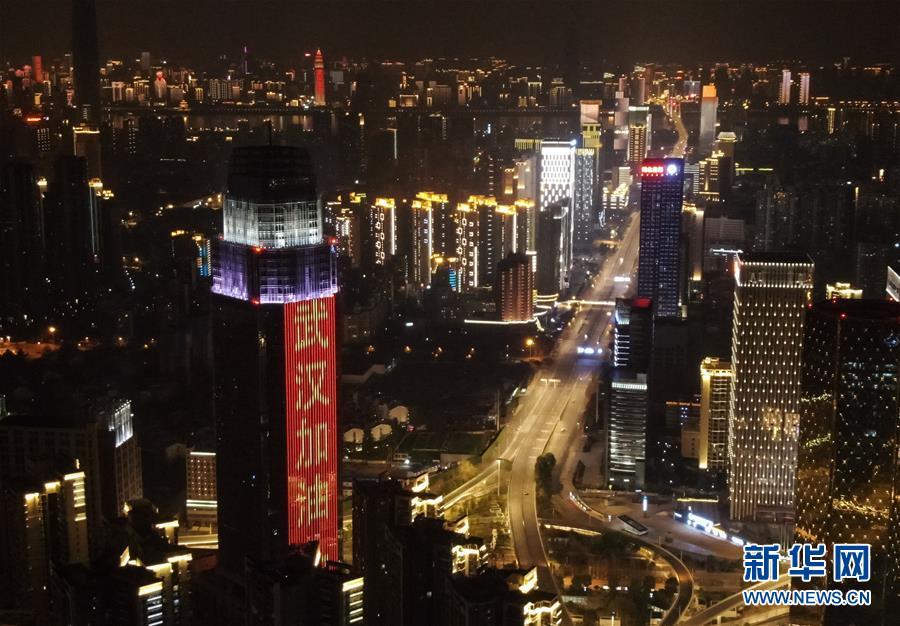 2月8日,武汉一高层建筑的景观灯打出“武汉加油”的字样。新华社记者 程敏 摄