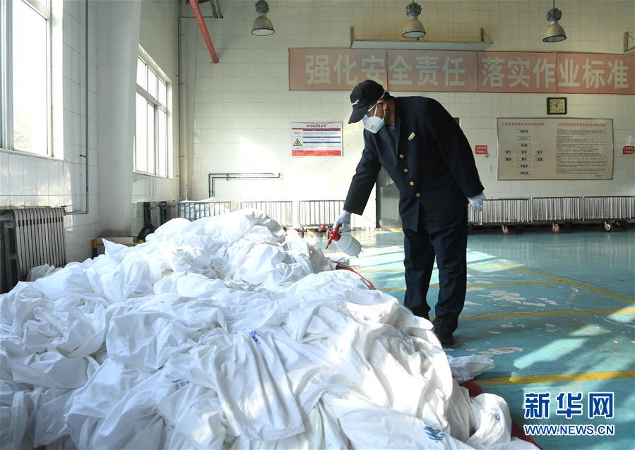 2月9日,在中国铁路北京局集团有限公司北京客运段洗涤车间脏品区,工作人员对当日列车中使用过的卧具进行消毒。 为做好新冠肺炎疫情防控工作,中国铁路北京局集团有限公司北京客运段洗涤车间加强对普速列车卧具、窗帘、头枕片、台布以及动车组列车头枕片等物品的洗涤与卫生消毒,保障旅客出行安全。 新华社发(任超摄)