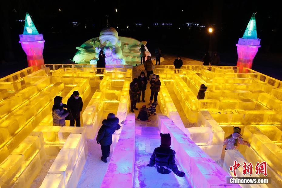 1月5日,第48届哈尔滨冰灯艺术游园会免票迎客。本届游园会以“冬奥之光,多彩冰灯”为主题,以冰雪艺术、公益惠民为宗旨,将在近万平方米的活动场地举办多种形式的群众性公益冰雕比赛,为2022北京冬奥会助力添彩。图为儿童争相体验冰滑梯。 中新社记者 姜辉 摄