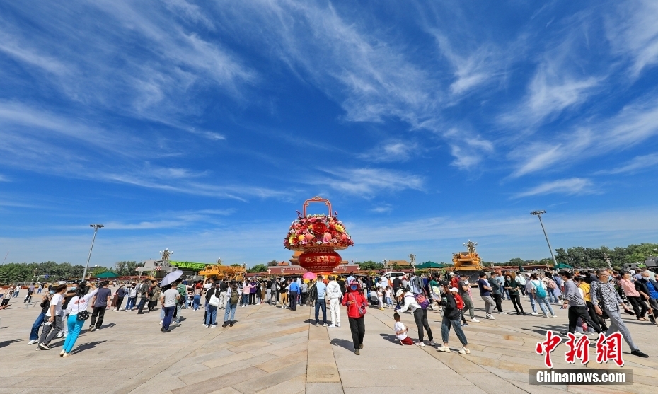 9月24日,“祝福祖国”巨型花果篮组装完成亮相北京天安门广场,吸引市民游客参观。 中新社发 刘宪国 摄 图片来源:CNSphoto