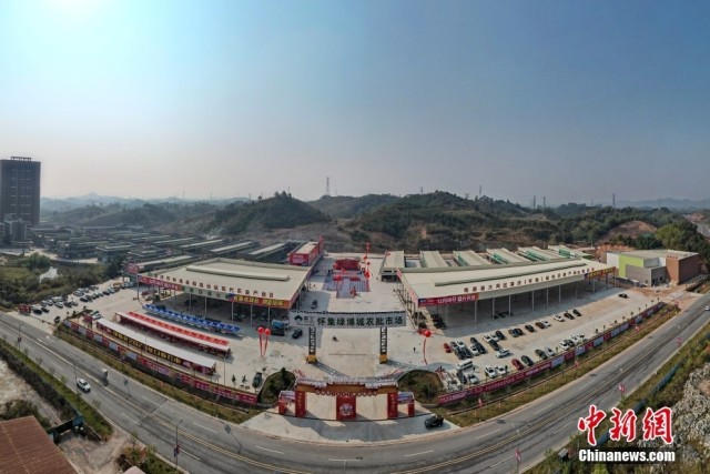12月28日,广东省肇庆市,粤港澳大湾区肇庆(怀集)绿色农副产品集散基地农产品交易中心正式开业。图为航拍粤港澳大湾区农产品交易中心。(无人机照片) 中新社记者 陈骥旻 摄