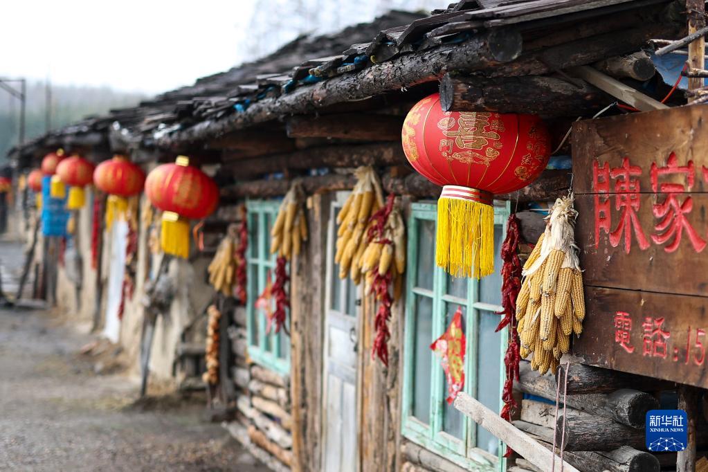 锦江木屋村一栋木屋外悬挂的灯笼、玉米和辣椒(2023年4月6日摄)。