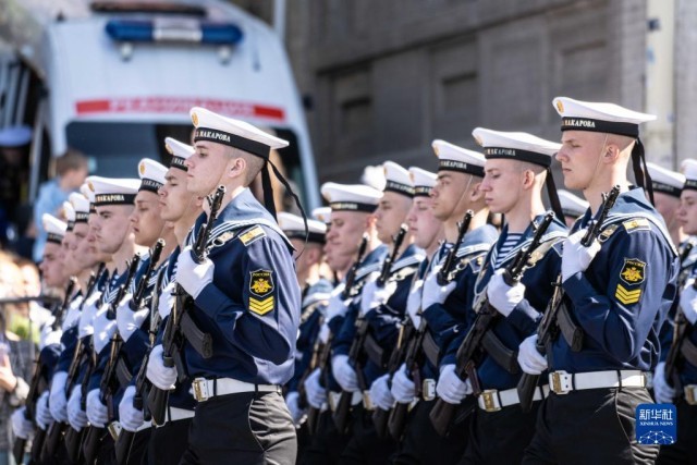 5月9日,在俄罗斯符拉迪沃斯托克市,海军士兵参加阅兵式。