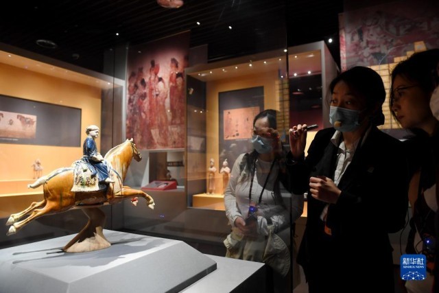 5月8日,游客在西安博物院参观唐代三彩腾空马。飞腾的三彩马上骑有一胡俑,真实再现了丝绸之路上西域胡人急奔长安的生动形象。
