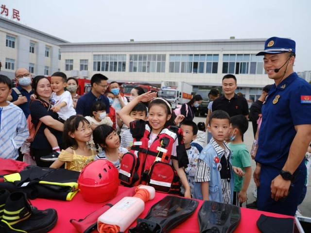 5月27日,四川成都,一名小朋友正在体验水域救援装备。当日,在“六一”国际儿童节来临之际,四川省森林消防总队成都大队联合成都市应急管理局开展亲子安全教育活动,邀请40名小朋友及其家属走进消防队伍,零距离跟随消防员体验消防生活,学习消防安全知识。程雪力/摄