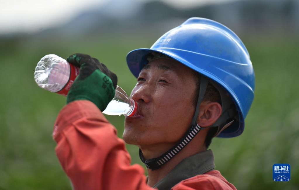 6月15日,在凌绥高速电力线路迁改工程现场施工的国家电网辽宁朝阳供电公司工程技术人员喝水解暑。