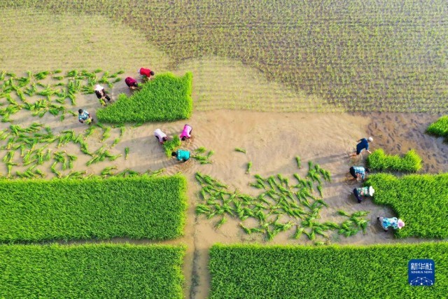 7月23日,在湖南省常宁市三角塘镇长江村,村民在起晚稻秧苗(无人机照片)。