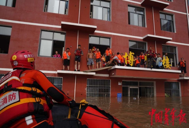 8月3日上午,河北涿州,涿州市靖雅学校,河北省唐山市消防救援支队的消防员驾驶冲锋舟进入学校救援受困群众。这所学校内集中了来自附近刁窝镇西茨村、北茨村、大柳村、小柳村、刁一村、佟村6个村庄的1400余名转移安置的村民。校园距离白沟河直线距离约2公里,白沟河在1日和2日两次决堤,该安置点逐渐被洪水包围,水位逐渐涨到超过一层楼高,最深处约3米。