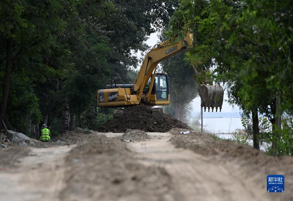 8月10日,在天津市静海区大清河台头段南堤,工程机械设备在堤坝上作业。