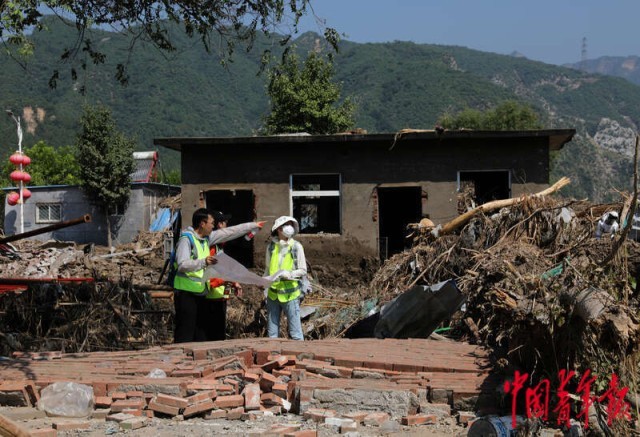 8月16日,北京市门头沟区丁家滩村,来自北大国土空间规划设计研究院的许泽祥(左一)和同事们在一处曾经被洪水没顶的房屋前勘查。这两天,来自北京多家单位的规划师兵分多路,前往村里水淹、墙裂较为严重的点位踏勘,进行灾后现状摸排与规划评估工作,为科学编制灾后重建规划收集第一手资料。据介绍,门头沟区在本次摸排行动共安排了16支队伍到各村庄进行灾后摸排评估,摸排工作重点为山区的138个村。中青报·中青网记者 陈剑/摄