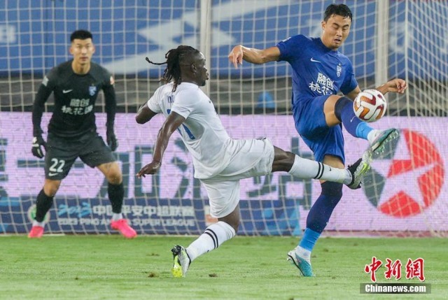 8月27日晚,武汉三镇队5号朴志洙(蓝色)在比赛中拼抢。当日,在湖北武汉举行的2023赛季中国足球协会超级联赛第24轮比赛中,武汉三镇队主场以4:2战胜南通支云队。