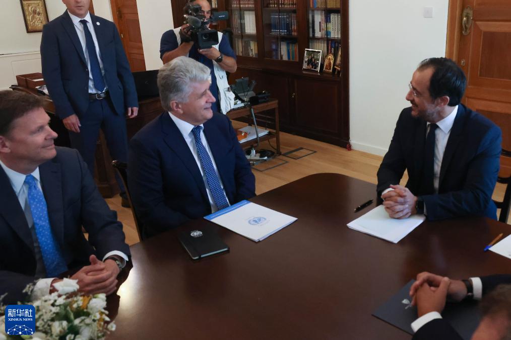 8月28日,在塞浦路斯尼科西亚,联合国负责欧洲、中亚和美洲事务的助理秘书长米洛斯拉夫·延恰(前中)与塞浦路斯希腊族领导人、总统赫里斯托祖利季斯(前右)举行会谈。