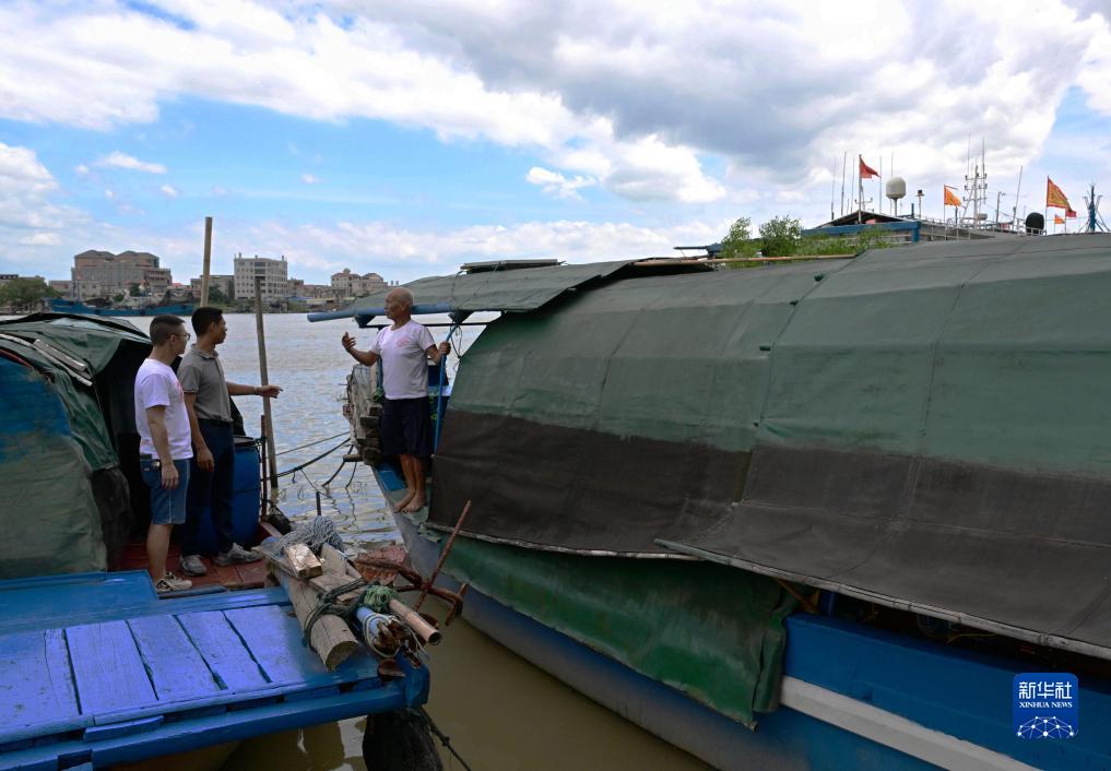8月30日,在福建漳州市龙海区石码镇渔业社区渔船专用码头,当地渔业社区工作人员在劝说船上渔民(右)上岸避风。