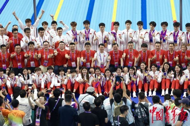 9月29日,杭州亚运会游泳迎来收官之战,中国队再夺4金2银1铜。至此中国游泳队在本届亚运会上获得了游泳项目41枚金牌中的28枚,创造了队史上的亚运会最佳战绩。中国游泳队还收获了21枚银牌,9枚铜牌,以总数58枚的成绩位列游泳奖牌榜第一。中青报·中青网记者 李隽辉/摄