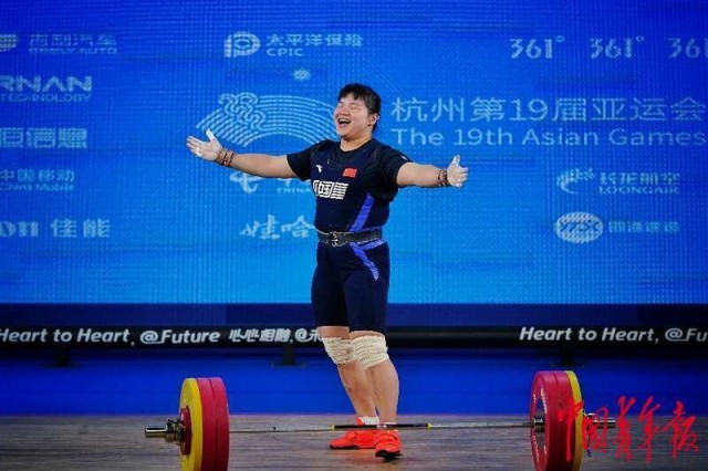 10月6日,杭州亚运会举重女子87公斤级决赛,中国选手梁小梅以抓举120公斤、挺举155公斤、总成绩275公斤获得冠军。这也是本届杭州亚运会中国女子举重的首枚金牌。中青报·中青网记者 赵迪/摄