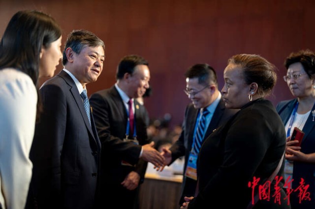 当日下午,生态环境部与国家发展改革委在国家会议中心共同举办绿色发展高级别论坛,共有来自 40多个国家和地区的400余名嘉宾参会。论坛聚焦“共建绿色丝路 促进人与自然和谐共生”主题,助力实现全球绿色低碳可持续发展。在共建“一带一路”倡议提出10周年之际,论坛发布了三项成果,分别为“一带一路”绿色发展北京倡议、绿色发展投融资合作伙伴关系以及中亚区域绿色科技发展行动计划。中青报·中青网记者 李隽辉/摄