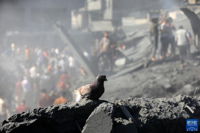 10月26日,在加沙地带南部城市汗尤尼斯,一只鸽子停留在建筑废墟上。
