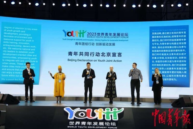 10月30日,北京首钢园,2023年世界青年发展论坛全体会议上,青年代表上台宣读《青年共同行动北京宣言》。当日,2023年世界青年发展论坛举行全体会议,会上,各国嘉宾发表主旨演讲、寄语并进行了圆桌对话。大会成果丰硕,与会嘉宾代表揭幕了世界青年发展论坛专项公益基金,启动了全球发展青年先锋奖学金,并发布了《青年共同行动北京宣言》。中青报·中青网记者 陈剑/摄