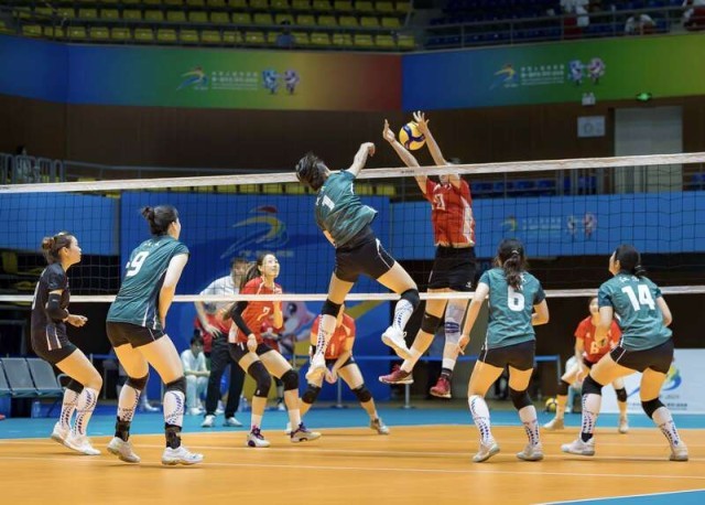 11月4日,广西钦州北部湾大学体育馆,第一届全国学生(青年)运动会校园组排球大学女子组决赛江苏队对阵北京队,江苏队队员扣球。本场比赛中,江苏队以3比2逆转北京队夺得冠军。钟雨云/摄