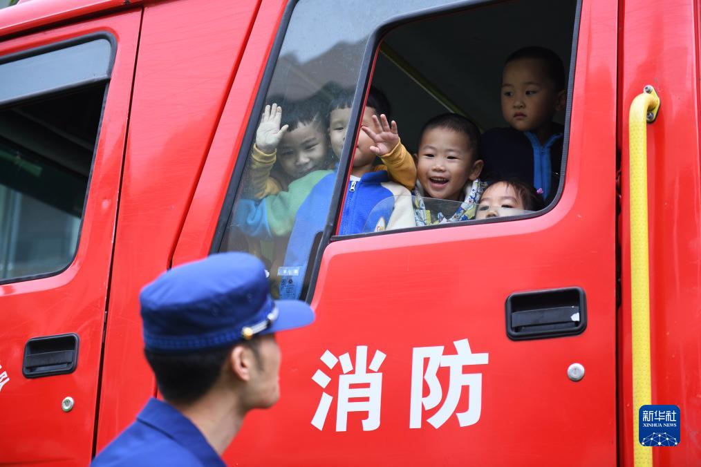 11月7日,四川省阆中市温岭幼儿园的小朋友登上消防车体验。