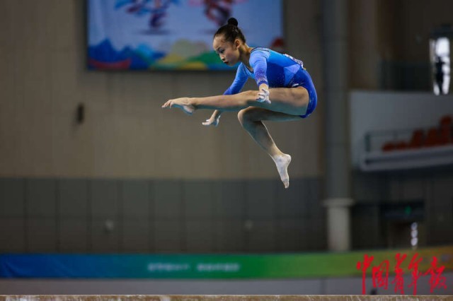 11月9日,广西南宁,学青会体操比赛女子乙组团体决赛,浙江省宁波市队11岁选手应亚欣在平衡木比赛中。当日,学青会体操女子乙组团体决赛在广西体育中心体育馆举行,参赛选手年龄全部为11岁和12岁。湖北省武汉市队在本场比赛中获得金牌。中青报·中青网记者 曲俊燕/摄