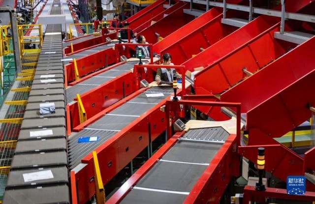 11月11日,工作人员在顺丰速运江苏泰州高港中转场小件自动化流水线上分拣快递包裹。