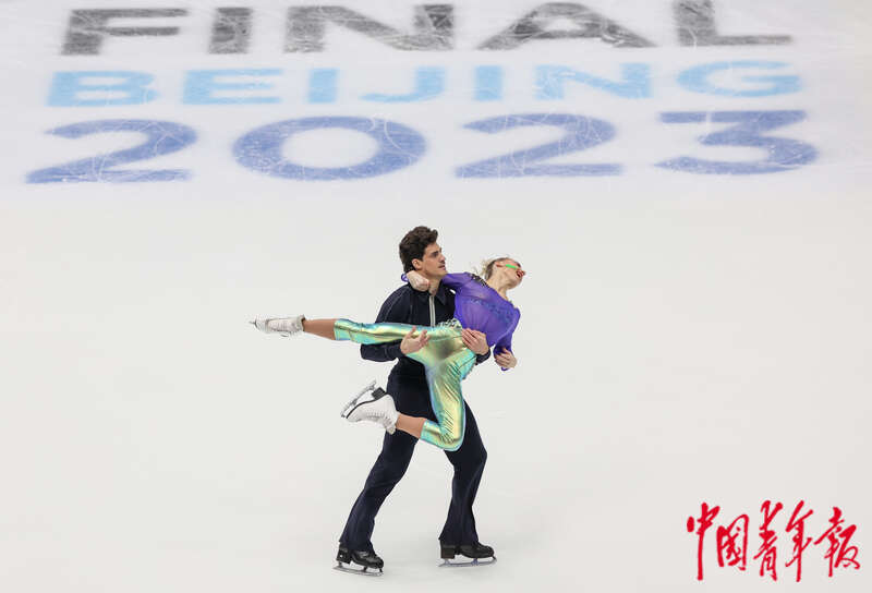 12月8日,北京国家体育馆,国际滑联世界花样滑冰大奖赛总决赛,加拿大组合派珀·吉勒斯(前)/保罗·波里尔在成年组冰舞韵律舞比赛中。当日,国际滑联世界花样滑冰大奖赛总决赛进入第二个比赛日,该赛事时隔13年再次在北京举办。中青报·中青网记者 曲俊燕/摄