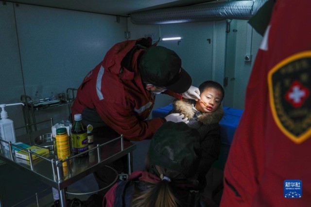 12月19日,在甘肃临夏积石山县大河家镇大河村安置点,甘肃省人民医院的医生在移动手术车上为小朋友清理伤口。