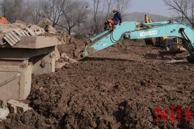 12月20日下午,青海省海东市民和县中川乡金田村,甘肃省森林消防总队一名救援人员通过挖机爬上屋顶,下方是厚厚的泥浆。积石山6.2级地震发生后不久,与积石山县相邻的青海省海东市民和县中川乡金田村因地震引发了“砂涌”现象,大量房屋被淤泥包围、冲毁,道路中断,目前仍有村民失联。救援人员正全力搜救被困群众并展开清淤工作,受灾村民被安置在村子附近的临时救助点。中青报·中青网记者 李隽辉/摄