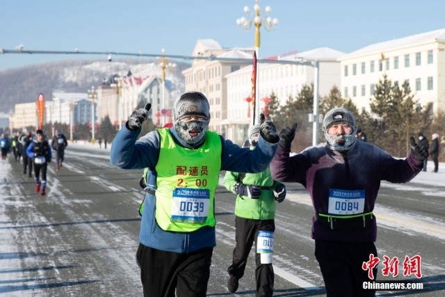 12月24日,运动员在赛道上奔跑。当日,2023第十届中国冷极马拉松在内蒙古自治区根河市鸣枪开赛,近千名中外选手在-38℃的“中国冷极”激情奔跑。