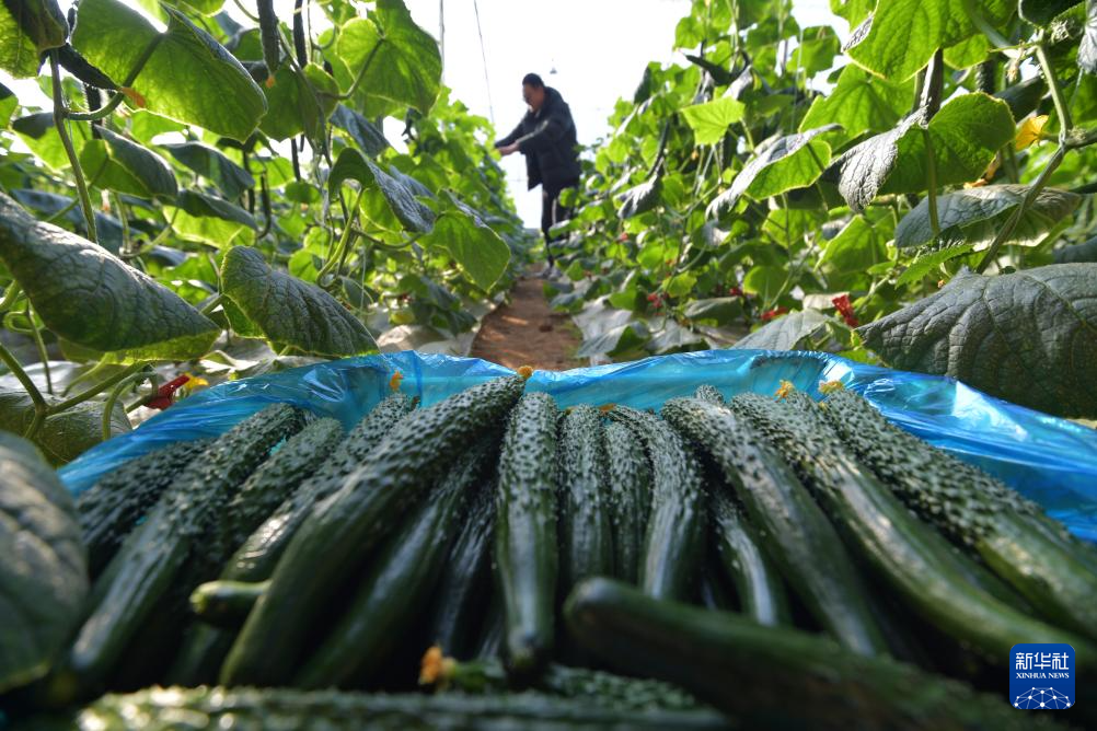 1月4日,在河北省石家庄市平山县东回舍镇东日家庭农场,农民在采收黄瓜。