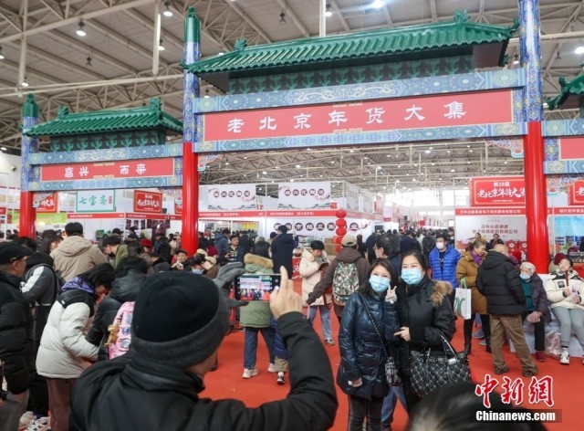 1月13日,第28届老北京年货大集在全国农业展览馆开市。大集上各地的土特产品和年货吸引大量市民来此置办年货。图为市民在大集的入口拍照。中新社记者 贾天勇 摄