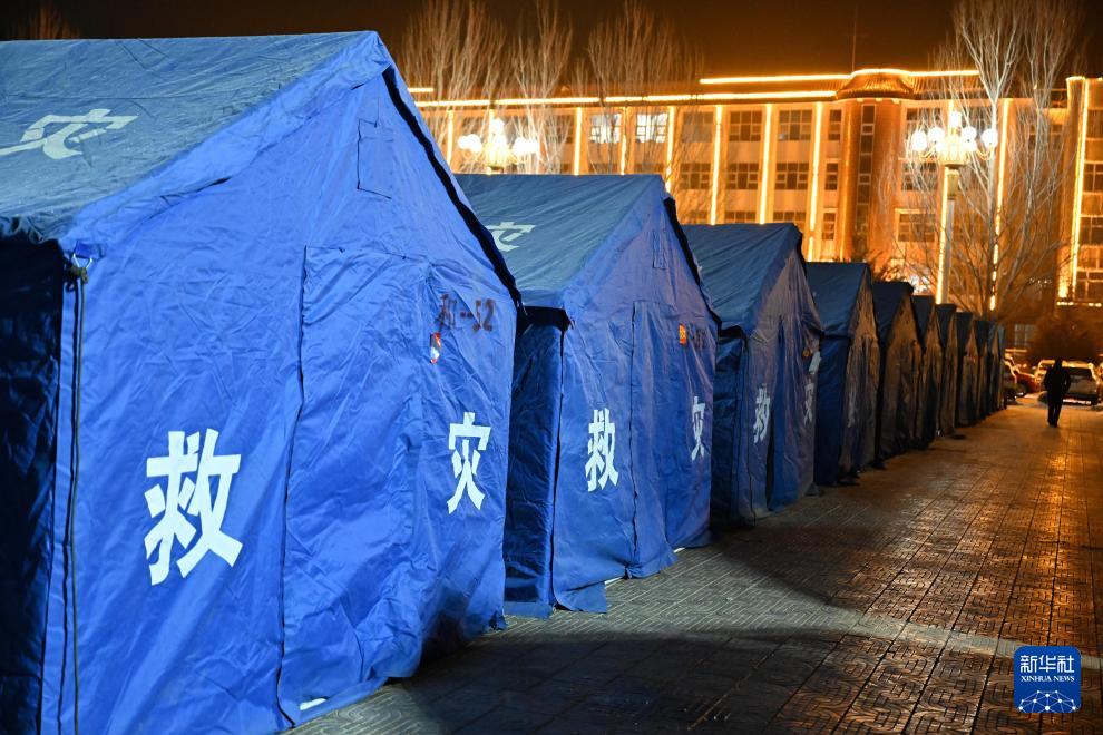 阿合奇县人民广场集中安置点搭建起的应急救灾帐篷(1月23日摄)。