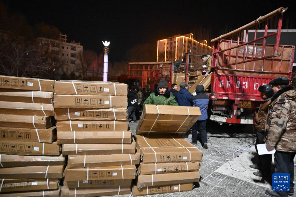 1月23日,在阿合奇县人民广场集中安置点,工作人员在搬运救灾物资。
