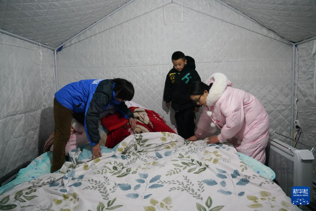 1月23日,在阿合奇县人民广场集中安置点,一户居民在帐篷里铺床。