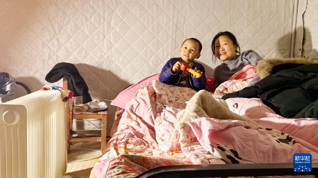 1月23日,在阿合奇县人民广场集中安置点,4岁的吴家豪(左)和家人在帐篷里休息。