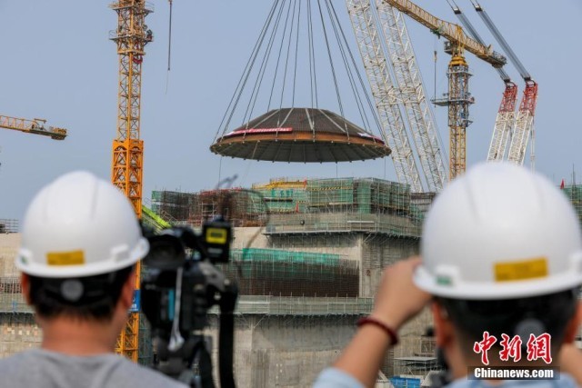 2月6日,全球首个陆上模块化小型核反应堆“玲龙一号”外穹顶在海南昌江吊装完成。此次吊装的外穹顶重约550吨,通过3200吨吊车历时1小时38分顺利就位。图为媒体记者在“玲龙一号”外穹顶吊装现场拍摄。