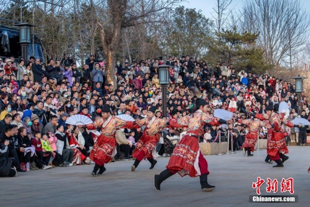 春节期间,在河南洛阳,“神都迎春·宫里过年”新春主题系列活动在隋唐洛阳城景区开展,《天门迎宾礼》《神宫乐舞》《唐茶表演》《明堂韶乐》《春节快闪》《春日宴》《神都夜宴》等节目分别在应天门、明堂天堂、九洲池等景点上演,为游客带来“唐”味浓浓的龙年新春。图为隋唐洛阳城九洲池景点上演“隋唐百戏”吸引游客观看。