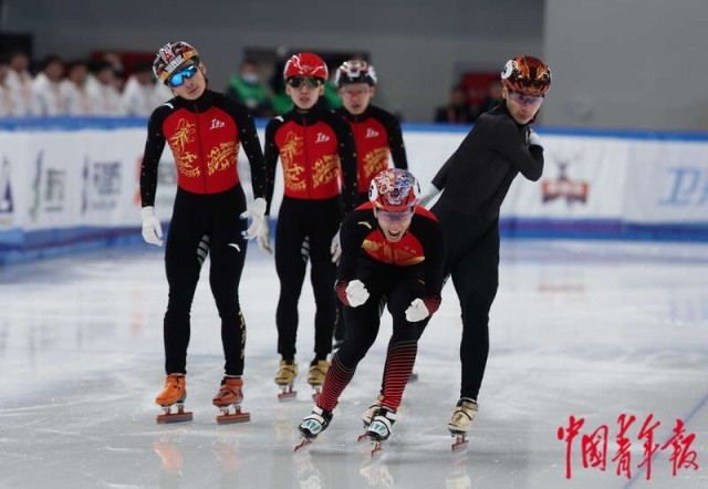 2月17日,内蒙古呼伦贝尔,海拉尔赛区,第十四届全国冬季运动会短道速滑男子500米决赛,吉林队选手孙龙(前)率先冲线。当天,第十四届全国冬季运动会短道速滑进行多项比赛,吉林队的两名选手孙龙、张楚桐分获短道速滑男子和女子500米冠军。中青报·中青网记者 曲俊燕/摄
