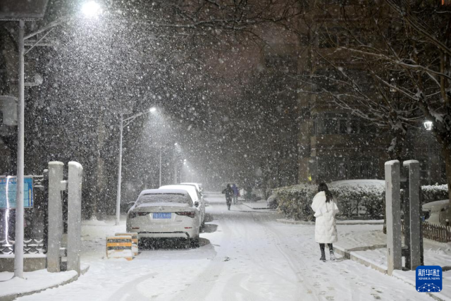 2月20日,在北京市大兴区郁花园二里小区,居民在雪中回家。