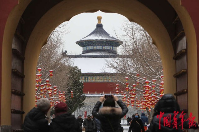 2月21日,北京天坛公园,市民游客在拍摄雪后的祈年殿。2月20日晚,北京迎来龙年首场降雪,雪后银装素裹的美景吸引了许多市民和游客出门踏雪赏景。中青报·中青网记者 孔斯琪/摄