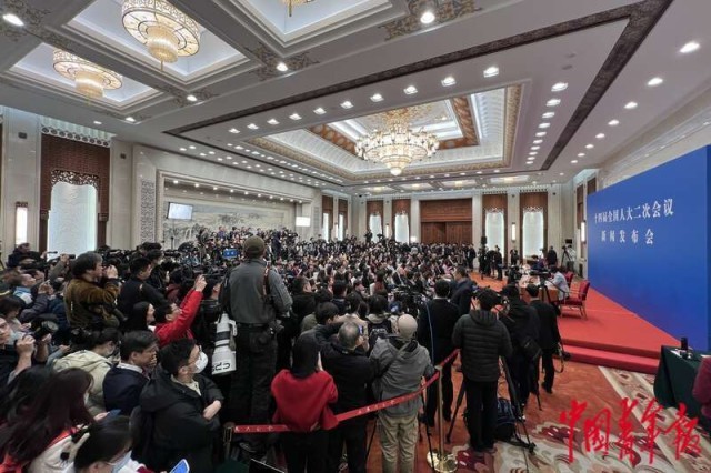 3月4日,北京,人民大会堂一层新闻发布厅,十四届全国人大二次会议新闻发布会开始前,现场座无虚席。当日12时,十四届全国人大二次会议在北京人民大会堂举行新闻发布会,大会发言人就大会议程和人大工作相关问题回答中外记者提问。中青报·中青网记者 李隽辉/摄