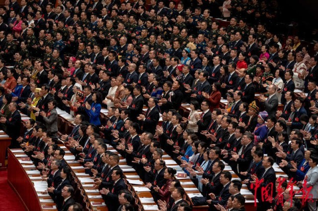 3月5日,北京人民大会堂,十四届全国人大二次会议第一次全体会议,代表们起立鼓掌。当日上午9时,十四届全国人大二次会议在北京人民大会堂开幕,大会听取国务院总理李强关于政府工作的报告。中青报·中青网记者 李隽辉/摄