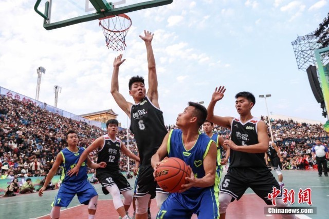3月22日,2024年“村BA”球王争霸赛贵州赛区第一场预选赛在贵州省台江县台盘村开赛。图为习水商会球队(黑衣)和黔东南州义工联球队在比赛中。