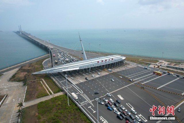 4月27日,港珠澳大桥边检站发布统计数据,自2018年10月港珠澳大桥开通以来,截至2024年4月27日16时5分,经港珠澳大桥珠海公路口岸出入境的车辆突破1000万辆次。图为3月30日,广东珠海,港澳车辆经港珠澳大桥抵达港珠澳大桥珠海公路口岸。(无人机照片)
