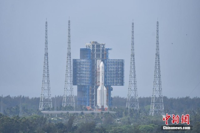 4月27日,海南文昌,嫦娥六号探测器和长征五号遥八运载火箭在中国文昌航天发射场完成技术区相关工作后,器箭组合体垂直转运至发射区,计划5月初择机实施发射。