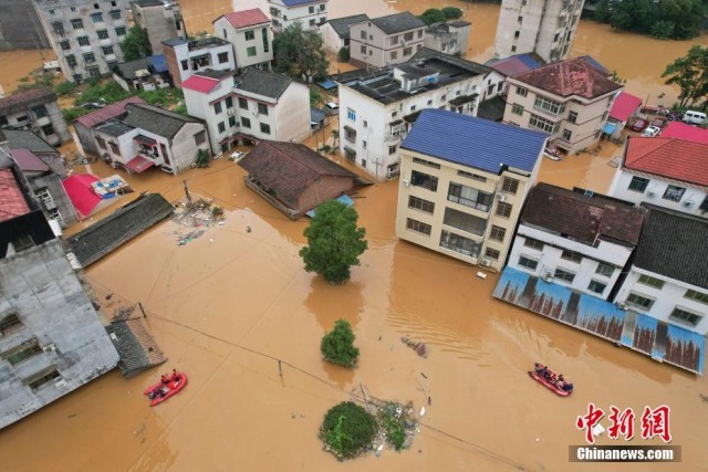 7月2日,救援人员在城区搜救被困民众。当日,来自湖南、广东、湖北等地的救援队伍纷纷参与到湖南平江县特大洪涝灾害的救援中,以“车轮战”的方式进行24小时不间断救援。(无人机照片)